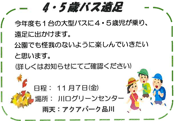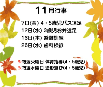 11月は4・5歳児はバス遠足・3歳児はお弁当を持って公園にお散歩に出かけます。
