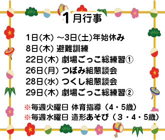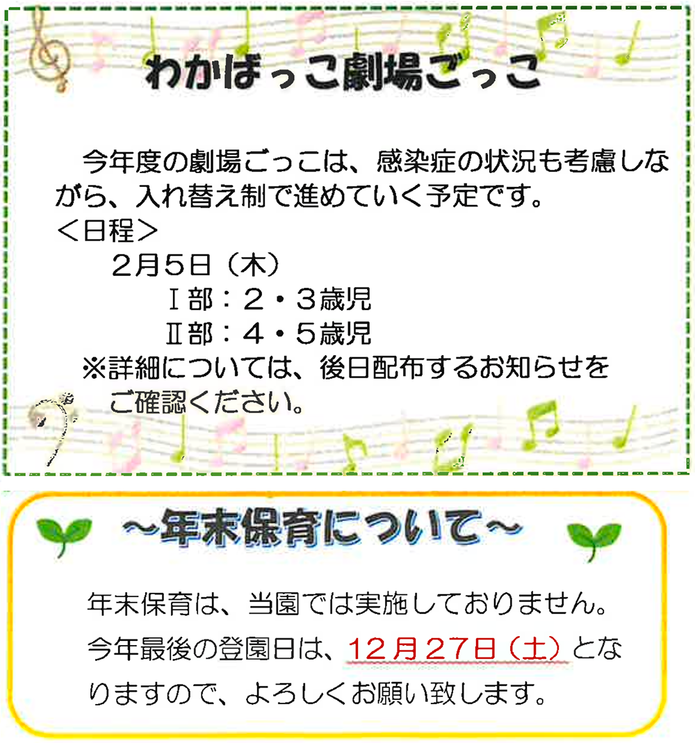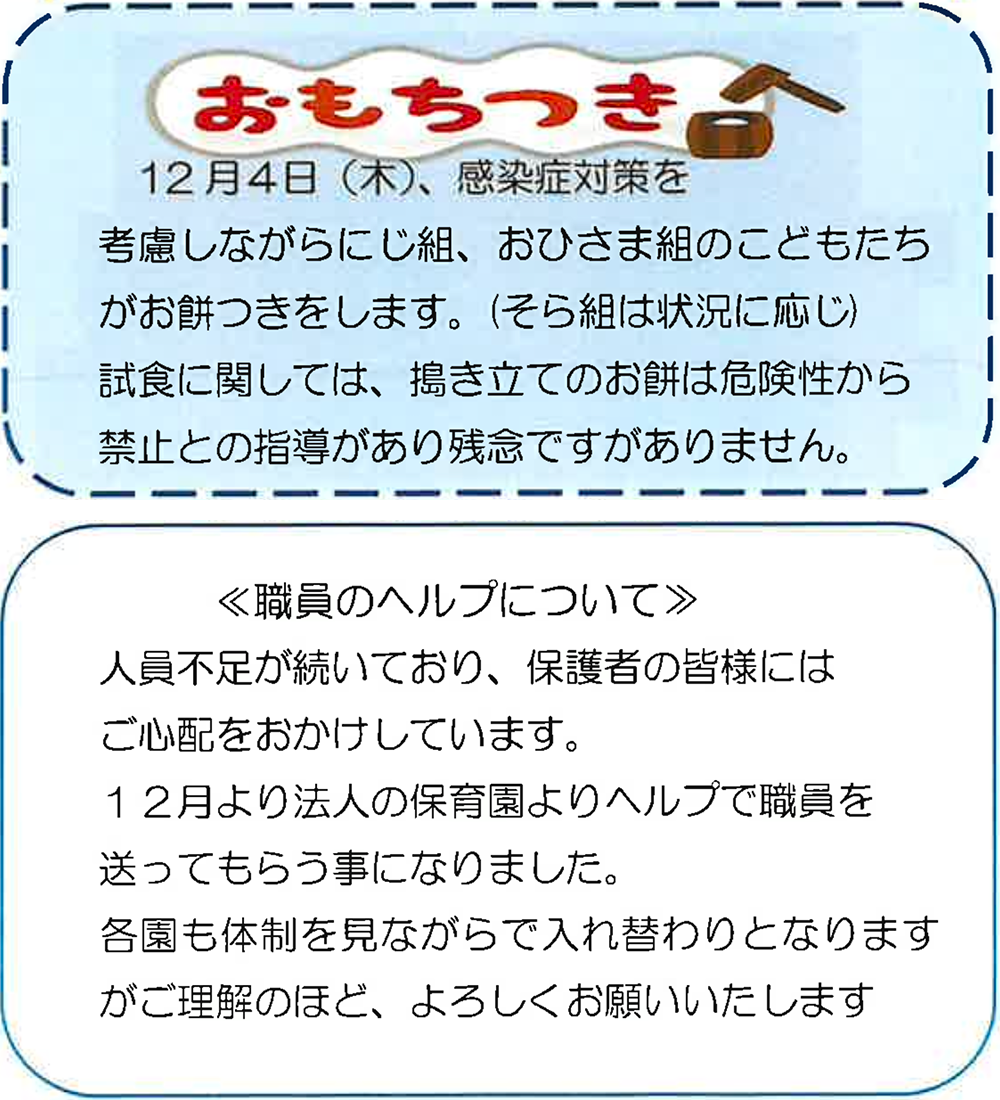 今年も瞬く間に過ぎ、あっという間に最後の月となりました。保護者の皆さまにも、いろいろとご協力頂き、ありがとうございました。年末年始、ご家族揃って元気に良いお年をお迎えください。